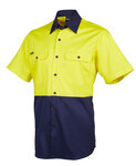 100% Cotton for 100% comfort,150gsm double pre-shrunk drill,Complies with Standard AS/NZS 4399:1996 for UPF Protection (UPF 50+),Complies with Standards AS/NZS 1906.4:2010 and AS/NZS 4602.1:2011 Day Only,Two-piece collar,Wide back neck yoke with concealed mesh, cooling gussets at underarms,Two front pockets with button-down flaps and pen insert,Contrast panel on front, back, long sleeves and collar,Curved hem with back tail styling